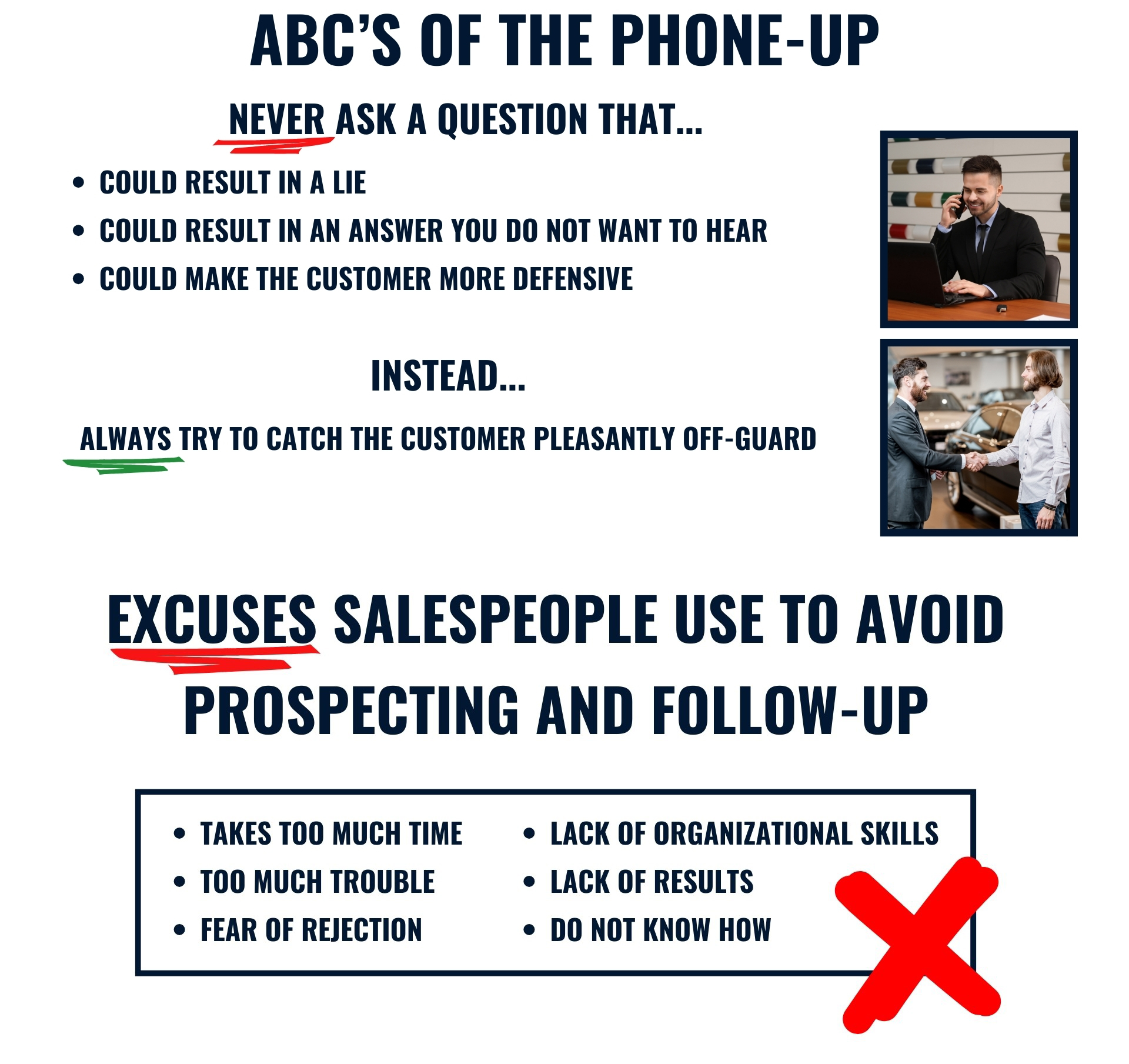 Yes and no, we do not have pre-designed scripts, we believe in training your staff to manage the calls without the need for a script. Organic conversation is much better than a script. However, while we are at the Dealership, we do work with the team to develop and customize defined bullet points for what to say during the conversation.